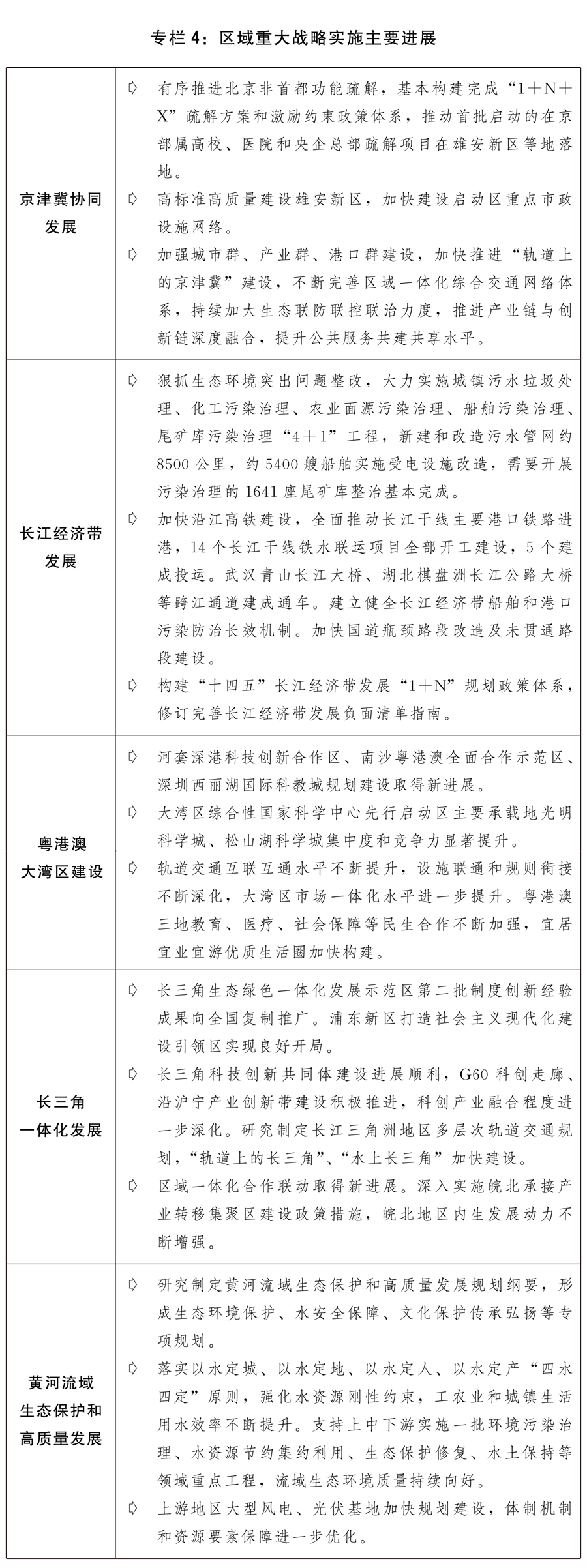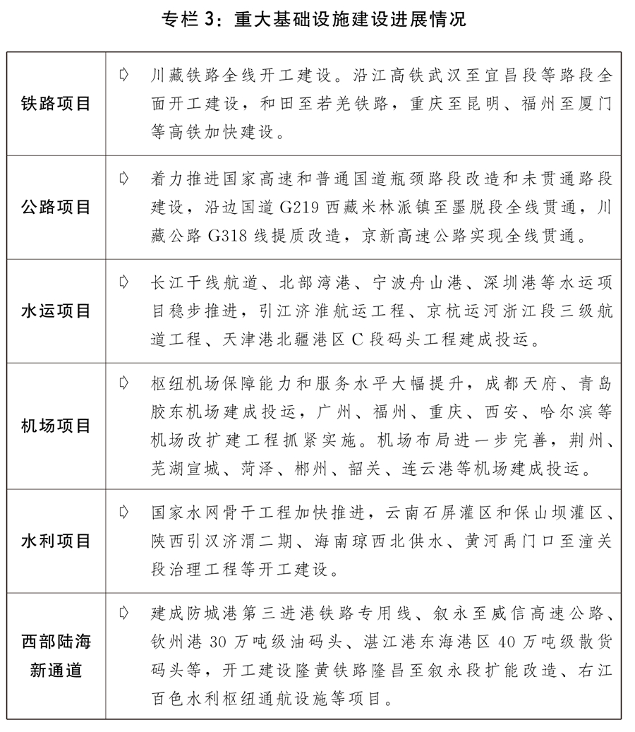 四是现代畅通系统加速扶植。编制现代畅通、现代物流、冷链物流、粮食物流等系列严沉专项规划,物流根本设备扶植稳步推进,全年新增国度物流枢纽25个,国度冷链物流扶植程序加速,“通道+枢纽+收集”现代物流运转系统初步构成。统筹开展县域贸易系统扶植和城市贸易提拔步履。积极鞭策物流降本增效,社会物流成本程度稳中有降。(五)全面实施村落复兴计谋,农业农村现代化结实推进。村落复兴计谋规划深切实施,脱贫地域成长能力不竭加强,农村一二三财产融合成长取得新进展。一是巩固拓展脱贫攻坚同村落复兴无效跟尾。确定160个国度村落复兴沉点帮扶县。加大跟尾推进村落复兴补帮资金投入力度,支撑欠发财地域培育特色劣势财产。加强对脱贫不不变户、边缘易致贫户和突发严沉坚苦户的监测帮扶,将240万人纳入低保或特困供养范畴。加大以工代赈和易地扶贫搬家后续搀扶工做力度,开展搬家安设区就业协做帮扶,根基实现有劳动力的搬家家庭至多一人就业,脱贫劳动务工规模达3145万人。鞭策消费帮扶提档升级,市场化帮扶比例跨越2/3。深化工具部协做和地方单元定点帮扶,开展“万企兴万村”步履,鞭策脱贫地域种养业高质量成长。二是现代农业根本持续夯实。及时无力做好洪涝、台风、干旱等天然灾祸应对,启动512处大中型灌区续建配套取现代化。对种粮农人一次性发放200亿元补助,应对农资价钱较快上涨等影响。提高稻谷、小麦最低收购价,确保口粮绝对平安。粮食总产量达到13657亿斤,实现高位减产,玉米年产量创汗青最高程度,肉蛋奶产量达到1。6亿吨,蔬菜、生果等“菜篮子”产物量脚价稳。农业出产力结构优化取布局调整加速推进,新建高尺度农田1。05亿亩。启动实施国度黑地盘工程,东北黑地盘性耕做7200万亩。开展全国农业种质资本普查,焦点种源手艺攻关加速推进,种业复兴稳步开局。推进棉花、食糖产供储加销系统扶植。三是村落扶植有序推进。实施村落扶植步履和农村人居整治提拔五年步履。实施农网巩固提拔工程,进一步提拔农村用电质量和程度。开展中小河道管理、大中型病险水库除险加固等水利亏弱环节工程扶植,防汛根本设备短板进一步补齐。加速长江黄河道域农业面源污染管理项目扶植,实施畜禽粪污资本化操纵整县推进项目。因地制宜推进农村茅厕,全国农村卫生茅厕普及率跨越70%。糊口污水和垃圾管理力度加大,糊口垃圾进行收运处置的天然村比例不变连结正在90%以上。现有行政村全面实现村村通宽带,农村自来水普及率达84%。深切推进农村财产融合成长,新建立一批农业现代化示范区、国度现代农业财产园,第三批国度农村财产融合成长现范园建立工做积极开展。(六)无效鞭策区域协调成长和新型城镇化扶植,区域经济结构调整优化。阐扬比力劣势、凸起区域特色,出力推进城乡融合成长,深切实施区域严沉计谋和区域协调成长计谋,地域经济运转稳中加固、稳中向好。一是区域严沉计谋深切实施。非首都功能疏解取得新冲破,国务院印发《关于支撑城市副核心高质量成长的看法》,雄安新区进入大规模扶植阶段,落实支撑天津滨海新区高质量成长的看法,首都水源涵养功能区和生态支持区加速扶植。长江经济带生态优先、绿色成长深切推进,生态凸起问题整改和污染管理“4+1”工程稳步推进实施,生态系统修复成效较着,长江十年禁渔实现优良开局,水生生物资本逐渐恢复,沿江分析交通运输系统加速建立,长江保正式实施。粤港澳大湾区扶植稳步推进,地方、国务院印发《横琴粤澳深度合做区扶植总体方案》、《全面深化前海深港现代办事业合做区方案》,根本设备和公共办事融合有序开展。长三角一体化成长深切推进,根本设备互联互通程度持续提拔,一体化成长体系体例机制不竭优化,地方、国务院印发《关于支撑浦东新区高程度打制社会从义现代化扶植引领区的看法》,建立长三角世界级口岸群构成一体化管理系统、共建虹桥国际枢纽等严沉使命无力推进,生态绿色一体化成长现范区扶植取得显著成效。“十四五”黄河道域生态和高质量成长实施方案印发,农业、工业、城镇糊口和尾矿库污染“3+1”分析管理方案结实推进,污染防治、生态修复、深度节水控水、水土连结等范畴严沉工程项目稳步实施,正在黄河省区完成1。2万平方公里水土流失管理使命。