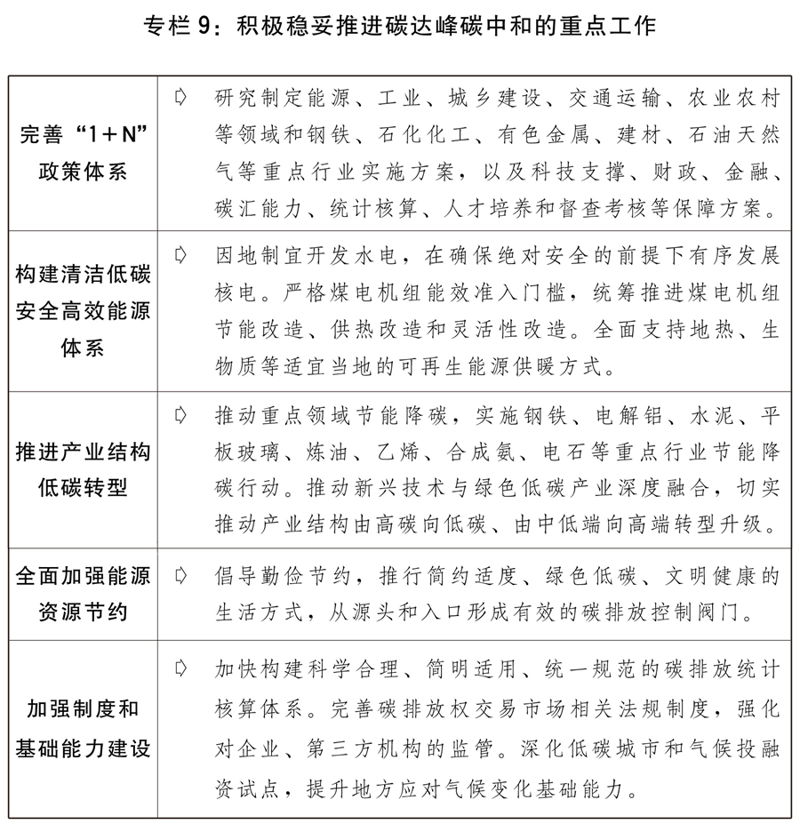 三是提拔新型城镇化扶植质量。持续推进农业转移生齿市平易近化,推进正在城镇不变就业糊口的农业转移生齿举家进城落户。持续优化城镇化空间结构,更好阐扬超大特大城市对周边市县辐射带动感化,培育构成现代化都会圈。持续推进成渝地域双城经济圈扶植,印发鞭策长江中逛、北部湾等城市群成长“十四五”实施方案。推进以县城为主要载体的城镇化扶植,加强县城根本设备扶植,加强分析承载能力,健全公共设备系统。健全特色小镇清单办理机制,统筹加强典型引和规范纠偏。(七)扩大高程度,鞭策外资外贸平稳成长。扶植更高程度型经济新体系体例,对内取对外相连系,全面提拔平台能级,培育国际合做合作新劣势。一是多措并举不变外贸。加大对中小微外贸企业精准帮扶。鼎力成长跨境电商、市场采购等外贸新业态新模式。建立完美海外仓尺度系统,不竭完美笼盖全球的海外仓收集。视情扩大先辈手艺、主要设备、环节零部件、能源资本产物、紧缺农产物等进口,加大中国品牌海外推介力度,支撑高手艺、高质量、高附加值等产物出口。鞭策数字商业立异成长。落实进口环节税收和出口退税政策。支撑内陆试验区提拔能级。扶植国度办事商业立异成长现范区和数字商业示范区。高质量扶植国度文化出口。正在自贸试验区和全国推进实施跨境办事商业负面清单,正在自贸试验区和海南商业港等试点对接国际高尺度推进轨制型。二是提高操纵外资程度。出台实施关于扶植更高程度型经济新体系体例、推进建立新成长款式的看法。实施好新版外资准入负面清单,修订扩大《激励外商投资财产目次》,指导更多外资投向先辈制制业、高手艺等行业范畴和部、东北地域。落实好外资企业国平易近待遇,鞭策严沉外资项目加速落地。增设办事业扩大分析试点。优化企业外债分类办理,完美对房地产、处所融资平台、低信用企业的外债调控,持续防备外债风险。三是提拔境外投资效益。持续鞭策境外严沉项目合做,摸索产能取投资合做新体例。优化境外投资结构,深化双边和第三方市场所做。指导金融机构办事沉点范畴和项目。深切实施境外投资提质效防风险系列办法,提高沉点从体境外投资程度,规范企业境外运营行为,支撑行业协会商会成立境外投资自律机制。四是鞭策共建“一带一”高质量成长。结实推进根本设备互联互通,加强严沉项目合做,沉视境外项目风险防控。深切推进处所参取共建“一带一”高质量成长,鞭策新疆、福建“一带一”焦点区扶植走深走实。鞭策“丝海运”、“冰雪丝”加速成长。加强中欧班列通道能力、枢纽节点、港口扩能扶植。完美“一带一”风险防控和平安保障系统。稳妥开展健康、绿色、数字、立异等范畴合做,鞭策境外煤电等“两高”项目绿色低碳转型成长。五是推进海南商业港扶植。加速港口和分析法律点的根本设备规划扶植等,为实现全岛封关运做创制前提。支撑港口、网等根本设备扶植。鼎力成长外向型经济,不竭夯实严沉平台和财产成长根本,聚焦沉点政策,依托沉点项目,以更鼎力度摸索商业投资化便当化法则。进一步强化严沉风险防控工做,加大高程度压力测试力度,成立健全风险预警、研判和措置联防联控机制。六是鞭策多双边经贸合做。果断多边商业体系体例,积极参取世界商业组织(WTO)。高质量实施《区域全面经济伙伴关系协定》(RCEP),积极推进插手《全面取前进跨承平洋伙伴关系协定》(CPTPP)和《数字经济伙伴关系协定》(DEPA)。鞭策取更多国度和地域商签高尺度自贸协定,加强互利合做。推进落实全球成长,鞭策国际成长合做。积极参取结合国、二十国集团(G20)、亚太经合组织(APEC)、金砖国度等多边机制合做。(八)深切推进生态文明扶植,结实鞭策绿色低碳成长。成立健全绿色低碳轮回成长经济系统,鞭策减污降碳协同增效,推进生态持续改善、资本操纵效率不竭提高。一是加速推进经济绿色转型。完美绿色手艺立异系统,扶植国度绿色手艺买卖核心。扶植绿色财产示范,修订绿色财产指点目次,鼎力成长节能环保财产。实施“十四五”洁净出产奉行方案,正在沉点行业开展洁净出产。完美绿色金融尺度系统和评价机制,阐扬国度产融合做平台感化,指导金融资本向工业绿色低碳范畴汇聚。深化消息依法披露轨制,鞭策对企事业单元开展环保信用评价。持续实施国度节水步履,开展城市公共供水管网漏损管理工程,鞭策老城区、城乡连系部、县城、乡镇污水收集管网扶植,加强京津冀、黄河道域、西北地域等沉点区域、流域水资本节约集约操纵,扶植海水淡化示范城市。抓好全链条粮食节约减损。推进废旧物资轮回操纵系统扶植和可轮回快递包拆规模化使用试点,组织开展大固体烧毁物分析操纵示范扶植和企业培育,推进废钢铁、废有色金属、烧毁灵活车、废旧家电、废塑料、厨余垃圾等城市烧毁物分类操纵和集中措置。二是积极稳妥推进碳达峰碳中和。完美碳达峰碳中和“1+N”政策系统,实施“碳达峰十大步履”,“全国一盘棋”。鼎力成长非化石能源,扶植大型风电、光伏项目,积极成长分布式新能源,积极鞭策海优势电集群化开辟,稳妥推进西南等地大型水电扶植,鼎力成长抽水蓄能,正在确保绝对平安的前提下积极有序成长核电,推进煤炭洁净高效操纵。提拔电网对可再生能源发