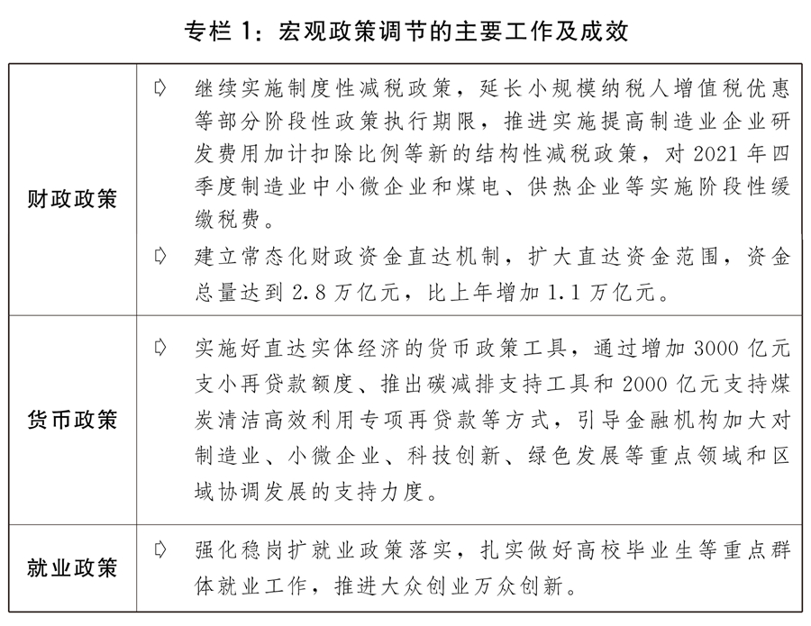 受国务院委托,现将2021年国平易近经济和社会成长打算施行环境取2022年国平易近经济和社会成长打算草案提请十三届全国五次会议审查,并请全国政协列位委员提出看法。2021年是党和国度汗青上具有里程碑意义的一年,也必将是载入史册的一年。我们隆沉庆贺中国成立一百周年,如期打赢脱贫攻坚和,正式颁布发表全面建成小康社会、实现第一个百年奋斗方针,全面扶植社会从义现代化国度、向第二个百年奋斗方针进军新征程。总结党的百年奋斗严沉成绩和汗青经验,通过百年党史上第三个汗青决议。正在以习同志为焦点的顽强带领下,各地域各部分以习新时代中国特色社会从义思惟为指点,全面贯彻党的十九大和十九届历次全会,伟大建党,按照、国务院决策摆设,认实施行十三届全国四次会议审议核准的《工做演讲》和审查核准的《中华人平易近国国平易近经济和社会成长第十四个五年规划和2035年近景方针纲要》、2021年国平易近经济和社会成长打算,落实全国财务经济委员会审查看法,完整、精确、全面贯彻新成长,结实做好“六稳”、“六保”工做,沉视宏不雅政策跨周期和逆周期调理,无效应对多种风险挑和,建立新成长款式迈出新程序,高质量成长取得新成效,统筹疫情防控和经济社会成长,全年次要方针使命较好完成,“十四五”实现优良开局,我国成长又取得新的严沉成绩。(一)强化外防输入内防反弹,常态化疫情防控无力有序。人平易近至上、生命至上,全链条精准防控“动态清零”,连结全球疫情防控劣势地位。一是分区分级防控行动精准高效。严酷落实人、物、同防办法,加强公共卫生防控救治能力扶植,最大限度遏制疫情通过港口,及时无效措置局部地域堆积性疫情,多措并举抓出产、增供应、强监测、畅物流,出力保障涉疫地域糊口必需品供应充脚、价钱平稳,保障了人平易近生命平安和身体健康,了一般出产糊口次序。二是疫苗接种和药物研发稳步推进。全力保障疫苗出产供应,截至2021岁尾,全国累计出产疫苗跨越50亿剂,提拔疫苗对变异毒株的顺应性,分地域、分春秋段推进疫苗接种,累计演讲接种新冠疫苗28。4亿剂次,完成全程接种人数跨越12亿人,全程接种笼盖率跨越85%。我国首个抗新冠病毒特效药获批上市。三是抗疫国际合做成效凸起。积极开展共享样本、共享数据、共享应对办法等。2021年,我国已向120多个国度和国际组织供给了跨越20亿剂疫苗,成为世界对外供给新冠肺炎疫苗最多的国度。参取并支撑新冠肺炎疫苗实施打算,提高疫苗正在成长中国度的可及性和可承担性,成长中国度迄今获得的疫苗大大都来国。(二)立异和完美宏不雅调控,经济根基盘进一步巩固。加速建立新成长款式,加强宏不雅政策跨周期调理,做好保供稳价工做,加大帮企纾困力度,实现了较高增加和较低通缩的优化组合,经济连结较好成长态势。一是经济增速稳居次要经济体前列。初步核算,2021年国内出产总值达到114。37万亿元,增加8。1%,是世界经济恢复成长的次要贡献国,占世界经济的比沉进一步提拔;人均国内出产总值跨越1。2万美元,跨越全球平均程度。全国城镇新增就业1269万人,全国城镇查询拜访赋闲率平均为5。1%,居平易近消费价钱指数上涨0。9%,国际出入连结根基均衡,岁暮外汇储蓄规模连结正在3。2万亿美元以上。二是连结宏不雅政策持续性针对性。宏不雅政策顺应跨周期调理需要,连结对经济恢复需要支撑力度,同时考虑为本年应对坚苦挑和预留政策空间。积极的财务政策提质增效、更可持续。连结需要的财务收入规模,处所专项债券刊行利用办理进一步优化,成立常态化财务资金中转机制,将2。8万亿元地方财务资金纳入中转范畴,及时为下层保根基平易近生、保工资、保运转供给财力支撑。全年新增减税降费为市场从体减负跨越1万亿元。对制制业中小微企业、煤电和供热企业实施阶段性缓缴税费。货泉政策矫捷精准、合理适度,矫捷使用降准、再贷款、再贴现等多种政策东西,两次全面降准,流动性连结合理丰裕,广义货泉供应量(M2)余额和社会融资规模存量别离增加9%和10。3%。加大对实体经济、沉点范畴和亏弱环节的支撑力度,企业分析融资成本稳中有降,全年新增人平易近币贷款19。95万亿元,比上年多增3150亿元,大型贸易银行普惠小微企业贷款增幅跨越40%,企业贷款平均利率为4。61%,比上年下降0。1个百分点。强化稳岗扩就业政策落实,结实做好高校结业生等沉点群体就业工做,推进公共创业万众立异。