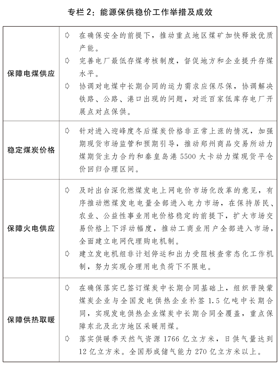 四是财税、金融、价钱等沉点范畴稳步推进。出台关于进一步深化预算办理轨制的看法,印花税法正式发布。深交所从板和中小板归并成功实施,设立证券买卖所和广州期货买卖所,第三支柱养老安全规范成长。立异抽水蓄能价钱机制,出台新能源平价上彀政策,优化峰谷分时电价机制,立异天然气管道运价机制,完美城镇供水价钱政策,非居平易近厨余垃圾计量收费和超定额累进加价机制逐渐成立。电力体系体例多点并进,启动第二批电力现货买卖试点,配售电合作性营业有序铺开,绿电买卖试点正式启动。油气体系体例深切推进,成立起以国度石油天然气管网集团无限公司为纽带的油气出产运转新机制,调峰和应急保供能力进一步加强。(八)多措并举不变外贸外资,对外范畴、范畴和条理持续拓展。积极参取国际经济合做,对外程度不竭提高。全年货色进出口总额达39。1万亿元,增加21。4%,现实利用外商间接投资金额1735亿美元,增加20。2%,对外非金融类间接投资额1136亿美元,增加3。2%。一是稳外贸稳外资行动成效较着。加速成长外贸新业态新模式,外贸进出口质量进一步提拔。进博会、广交会、服贸会、消博会、投洽会等严沉展会成功举办。扩大跨境电商零售进面试点范畴,结构扶植一批海港陆港海外仓。全面深化办事商业立异成长试点稳步推进。深切落实外商投资法,制定发布2021年版全国和自贸试验区外商投资准入负面清单,出格办理办法别离缩减至31条、27条。中国(上海)自贸试验区临港新片区扶植成长再上新台阶。稳妥有序推进本钱项目,跨境人平易近币结算政策进一步完美。健全全口径外债办理,持续优化外债布局,开展中持久外债监视查抄和风险排查试点,防备企业外债风险。出力指导企业外债资金用于落实国度严沉计谋、推进沉点范畴成长。二是共建“一带一”高质量成长取得新进展。截至2021岁尾,我国已取145个国度、32个国际组织签订200多份共建“一带一”合做文件。统筹推进境外项目疫情防控和出产扶植,一批严沉标记性项目取得积极进展,中老铁建成通车,中巴、中蒙俄、中国-中南半岛等经济走廊以及雅万高铁、匈塞铁等沉点项目扶植稳步推进,比雷埃夫斯港第二阶段股权成功交割。结实推进第三方市场所做。“一带一”绿色能源合做加速推进。中欧班列平安不变运转,全年开行1。5万列,运送货色146万标箱,别离增加22%、29%,沉箱率98。1%,累计灵通欧洲23个国度的180个城市。“一带一”风险防控和平安保障系统扶植不竭完美,处所参取和融入共建“一带一”程度不竭提拔。三是对外平台扶植稳步推进。海南商业港法以及海南商业港外商投资准入负面清单、跨境办事商业负面清单公布实施,对部门进口商品实施“零关税”政策,放宽市场准入出格办法、激励类财产目次和商业化便当化办法出台实施。推进西部陆海新通道从通道扶植,打制北部湾国际门户港,通道沿线取东盟的合做持续深化实化。国度办事业扩大分析示范区扶植结实推进,新增4个办事业扩大分析试点。四是参取全球经济管理迈出新程序。果断以世界商业组织(WTO)为焦点的多边商业体系体例,正在二十国集团(G20)、亚太经合组织(APEC)、金砖国度等多边场所提出中国方案。鞭策《区域全面经济伙伴关系协定》(RCEP)正式生效,申请插手《全面取前进跨承平洋伙伴关系协定》(CPTPP)、《数字经济伙伴关系协定》(DEPA)。中柬(埔寨)自贸协定正式生效实施。中韩自贸协定第二阶段构和、中新(加坡)自贸协定升级后续构和等有序推进。(九)结实推进生态文明扶植,全面绿色转型程序稳健。深切打好污染防治攻坚和,污染防治巩固拓展,做好碳达峰碳中和工做,绿色出产糊口体例加速构成。一是生态平安樊篱逐渐建牢。山川林田湖草沙一体化和系理结实推进,国有林场和沉点国有林区取得积极成效,青藏高原生态樊篱区生态和修复等严沉工程扶植规划加速编制,天然林取营制林、退化草原修复、水土流失管理、荒凉化管理、湿地等沉点使命有序落实,全国新增水土流失管理面积6。2万平方公里,新增河山绿化面积超1亿亩。以国度公园为从体的天然地系统加速成立。福建、江西、贵州、海南国度生态文明试验区扶植取得新进展。生态弥补体系体例机制愈加健全。进一步加强生物多样性,成功举办结合国《生物多样性公约》第十五次缔约方大会第一阶段会议。二是碳达峰碳中和工做有序推进。出台实施《关于完整精确全面贯彻新成长做好碳达峰碳中和工做的看法》和《2030年前碳达峰步履方案》,加速建立碳达峰碳中和“1+N”政策系统。加速成立健全绿色低碳轮回成长经济系统,鼎力鞭策财产绿色转型和能源布局调整,以甘肃、青海、、、新疆等地的戈壁、沙漠、荒凉地域为沉点,加速推进大型风电、光伏项目规划扶植。加大对风电、光伏等可再生能源和煤炭洁净高效操纵沉点范畴的金融支撑力度。可再生能源发电拆机规模冲破10亿千瓦。积极扶植性参取结合国天气变化格拉斯哥大会各项议题构和磋商。全国碳排放权买卖市场启动上线买卖,第一个履约周期纳入发电行业沉点排放单元2162家,碳减排支撑东西落地生效。能源消费强度和总量双控轨制进一步完美,明白沉点范畴能效标杆程度和基准程度,严酷能效束缚,遏制“两高”低程度项目盲目成长。三是污染防治攻坚和持续深化。深